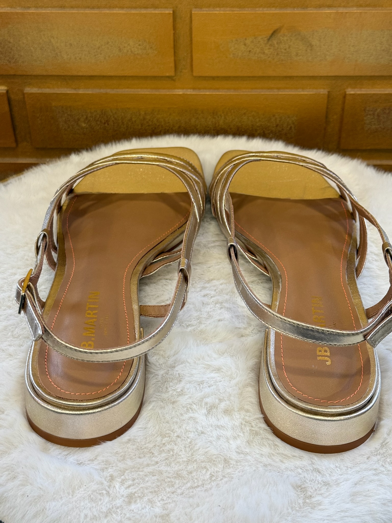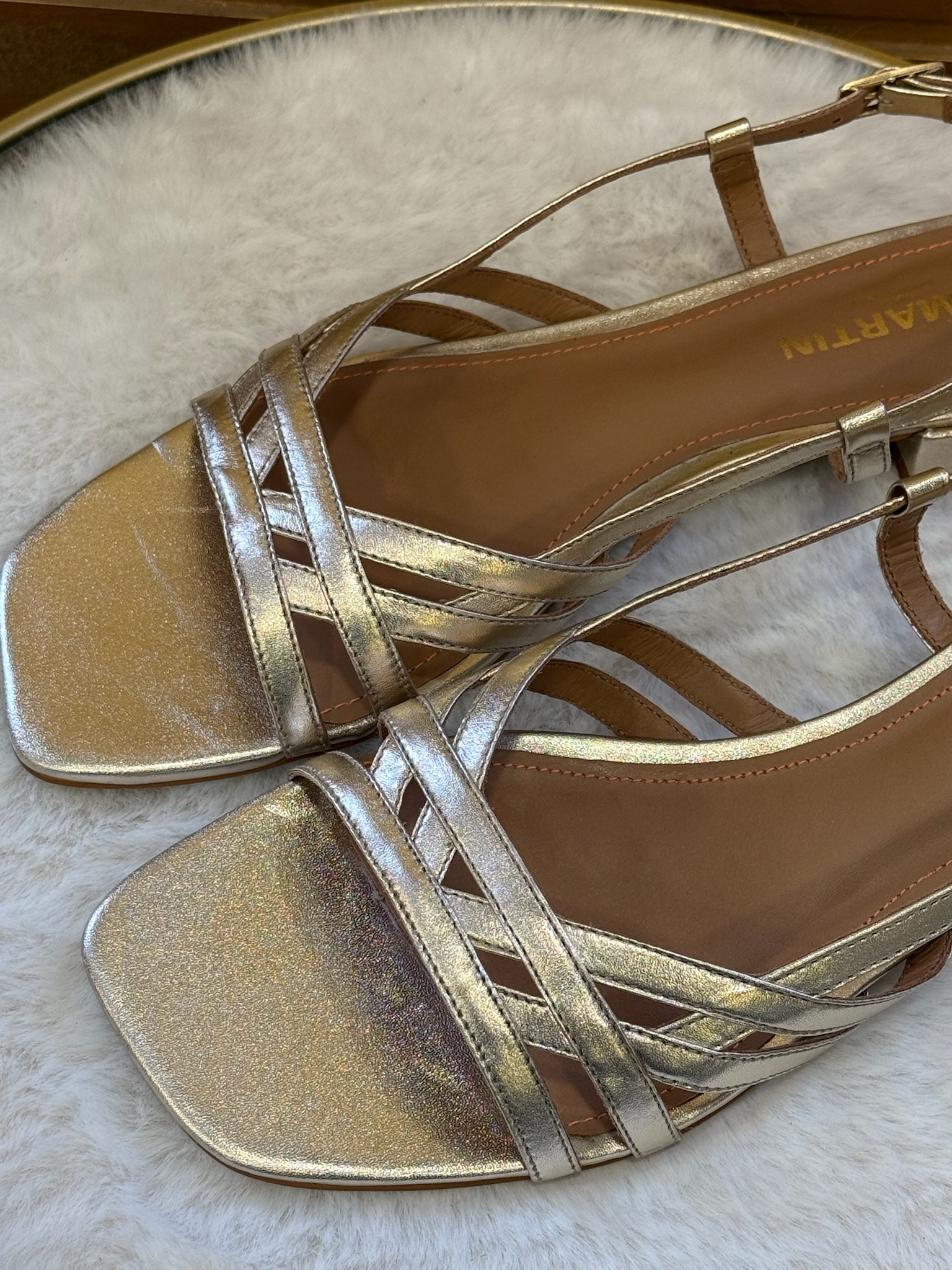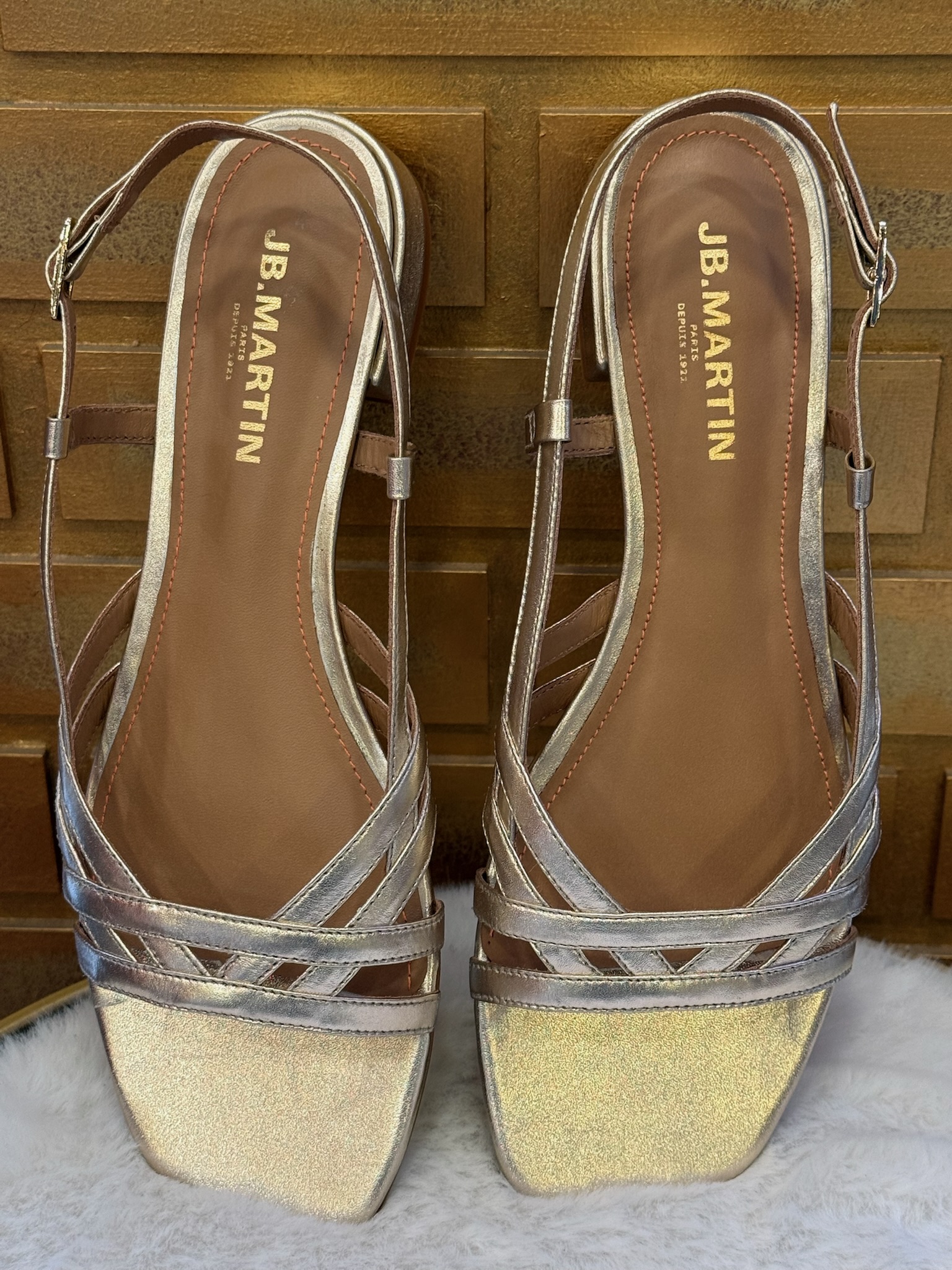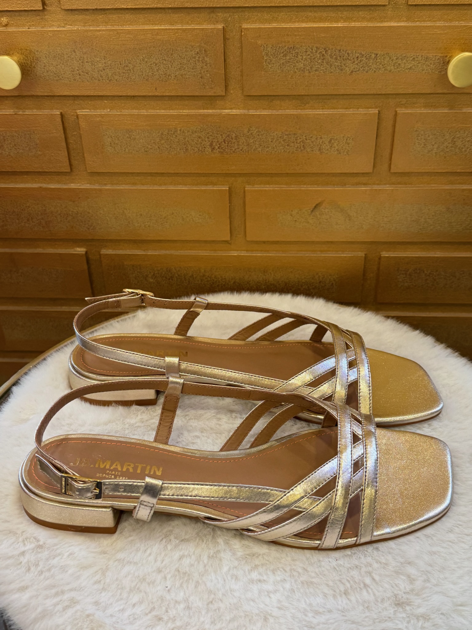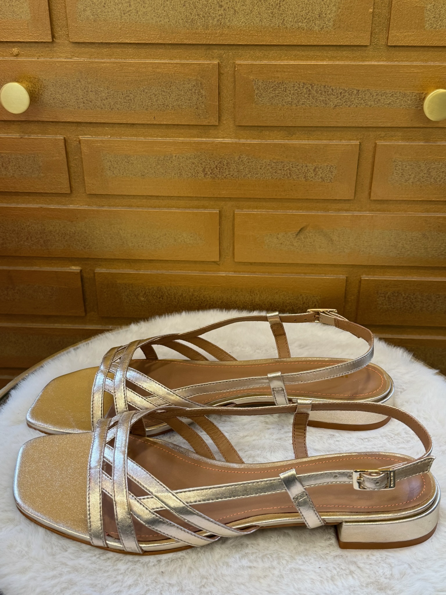 Pour entretenir le cuir doré, utilisez un chiffon doux légèrement humide et évitez les produits abrasifs. Rangez vos sandales à l’abri de la chaleur et de l’humidité pour préserver leur éclat.❓Questions fréquentes
